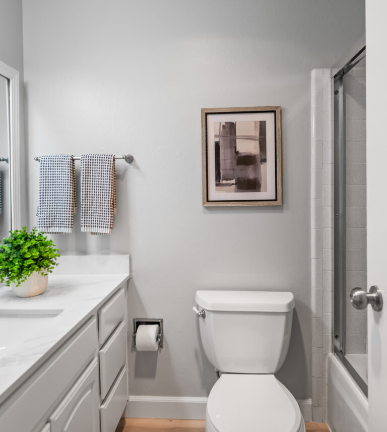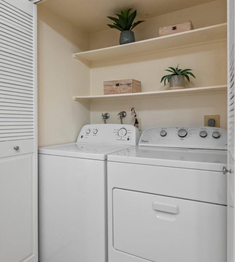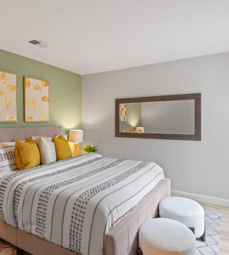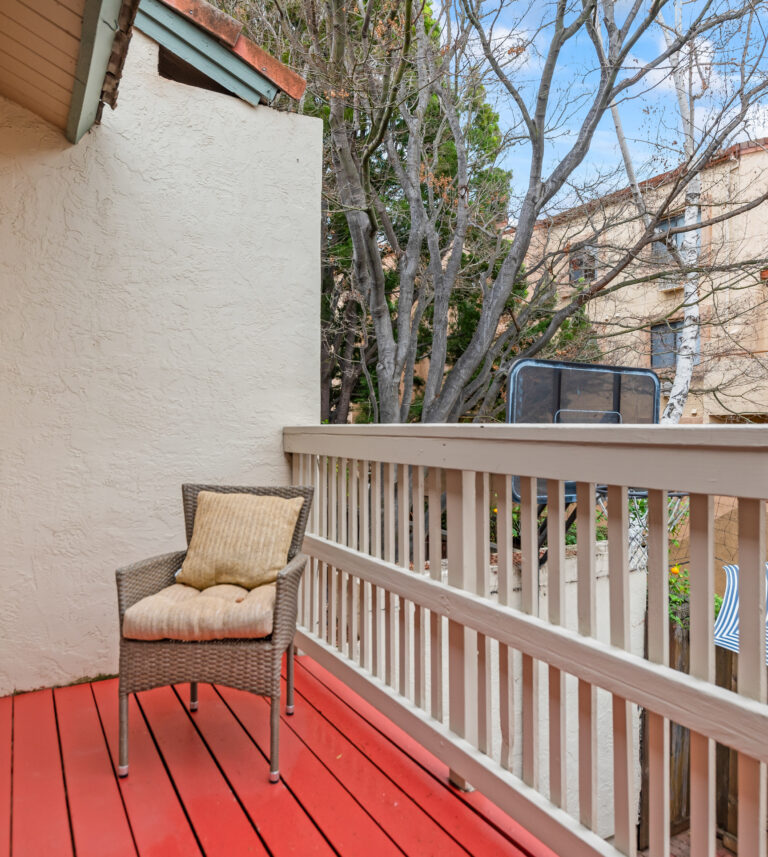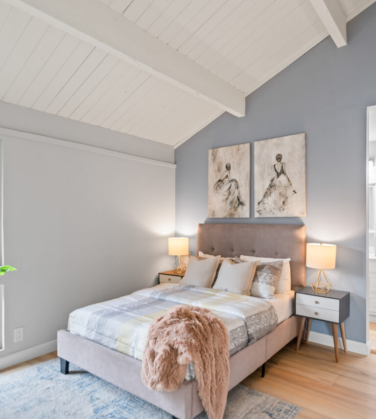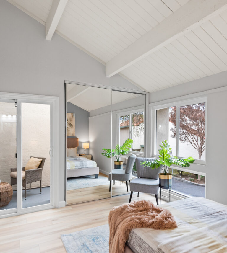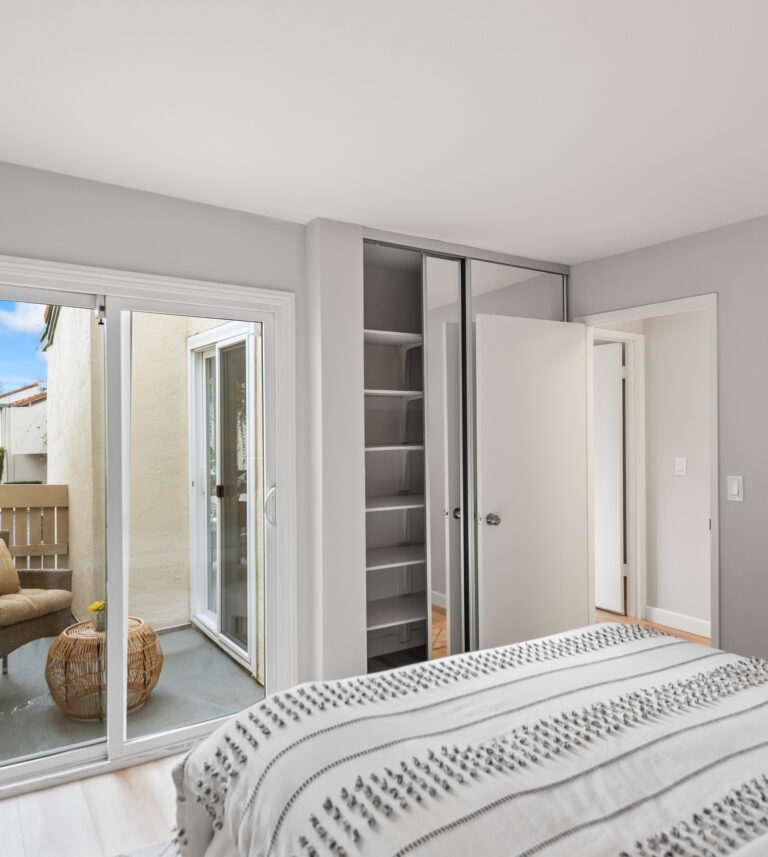 Relax in the primary bedroom that includes vaulted ceilings, two closets, and ensuite bathroom with dual sinks. Both bedrooms lead to a second private courtyard.